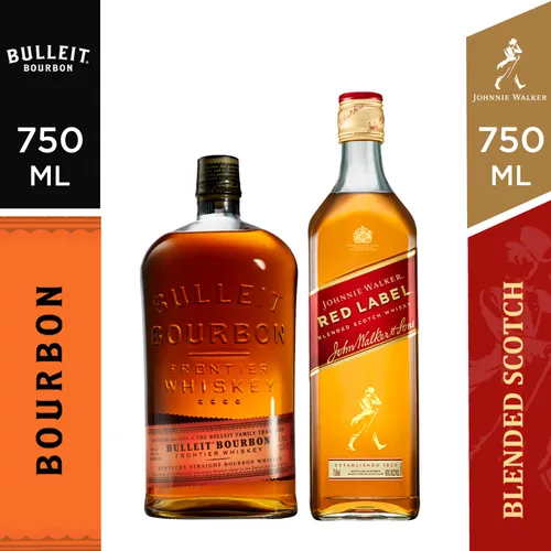 Johnnie Walker Red Label es conocido por su car谩cter vibrante y su mezcla de maltas seleccionadas, que aportan notas de especias y frutas. Por otro lado, Bulleit Bourbon destaca por su alto contenido de centeno, brindando un perfil robusto y un final suave que complementa a la perfecci贸n al Scotch.